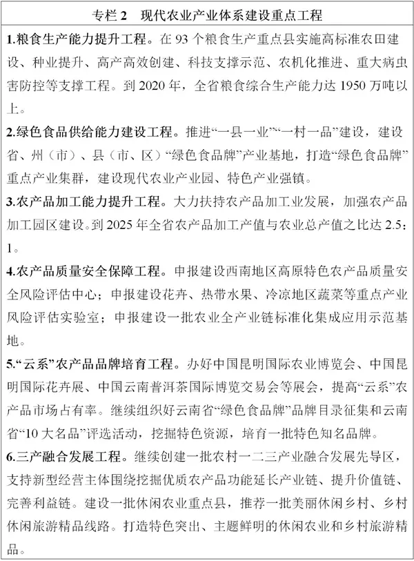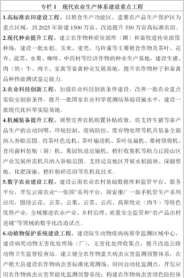 全力穩(wěn)定糧食綜合產(chǎn)能。堅(jiān)持藏糧于地、藏糧于技,樹立大食物安全觀,立足糧食供需平衡區(qū)的基本省情,確保糧食種植面積穩(wěn)定在6250萬畝左右,在93個(gè)稻谷、玉米、小麥等糧食生產(chǎn)重點(diǎn)縣(市、區(qū))集中連片建設(shè)糧食生產(chǎn)核心區(qū),打造一批綠色高質(zhì)高效示范基地。在“九湖兩江”流域大力推廣“水稻+”綜合種養(yǎng)模式,探索水稻田保護(hù)和農(nóng)業(yè)綠色生態(tài)發(fā)展路徑。努力挖掘糧食生產(chǎn)潛能,大力發(fā)展晚秋糧食生產(chǎn)和冬季農(nóng)業(yè)開發(fā),擴(kuò)大小雜糧、小雜豆、馬鈴薯、鮮食玉米等糧食作物面積。到2025年,全省糧食產(chǎn)量達(dá)1950萬噸。縱深推進(jìn)特色產(chǎn)業(yè)發(fā)展。圍繞糧食、茶葉、花卉、水果、蔬菜、堅(jiān)果、咖啡、中藥材、生豬、肉牛等“綠色食品牌”重點(diǎn)產(chǎn)業(yè),深入實(shí)施“一二三”行動(dòng),打造“一縣一業(yè)”,抓住種子和電商兩端,推進(jìn)設(shè)施化、有機(jī)化、數(shù)字化發(fā)展。到2025年,“綠色食品牌”重點(diǎn)產(chǎn)業(yè)綜合產(chǎn)值實(shí)現(xiàn)翻番。穩(wěn)定糖料蔗產(chǎn)能。鞏固臨滄市、普洱市、德宏州、西雙版納州等適宜區(qū)種植面積,加快中低產(chǎn)蔗田改造,加強(qiáng)適宜丘陵山地機(jī)具的研發(fā)和推廣應(yīng)用,到2025年,全省糖料蔗產(chǎn)量穩(wěn)定在1600萬噸左右。促進(jìn)橡膠產(chǎn)業(yè)轉(zhuǎn)型升級(jí)。擴(kuò)面增產(chǎn)、強(qiáng)質(zhì)提特、輻射全國,西雙版納州、普洱市等地區(qū)加快發(fā)展特種膠園,因地制宜發(fā)展生態(tài)膠園,打造國內(nèi)天然橡膠生產(chǎn)供應(yīng)主基地。加快綠色生態(tài)漁業(yè)發(fā)展。