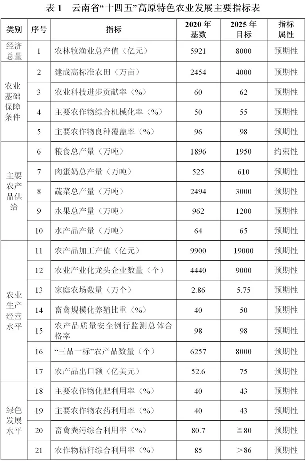 “十四五”時(shí)期,云南高原特色農(nóng)業(yè)發(fā)展的總體目標(biāo)是:在確保糧食等主要農(nóng)產(chǎn)品有效供給基礎(chǔ)上,以做特“綠色食品牌”為抓手,深入推進(jìn)農(nóng)業(yè)供給側(cè)結(jié)構(gòu)性改革,加快農(nóng)業(yè)產(chǎn)業(yè)轉(zhuǎn)型升級(jí),不斷提升農(nóng)業(yè)現(xiàn)代化水平,促進(jìn)農(nóng)民收入持續(xù)穩(wěn)定增長,實(shí)現(xiàn)一定水平的農(nóng)業(yè)高質(zhì)高效,農(nóng)民富裕富足。