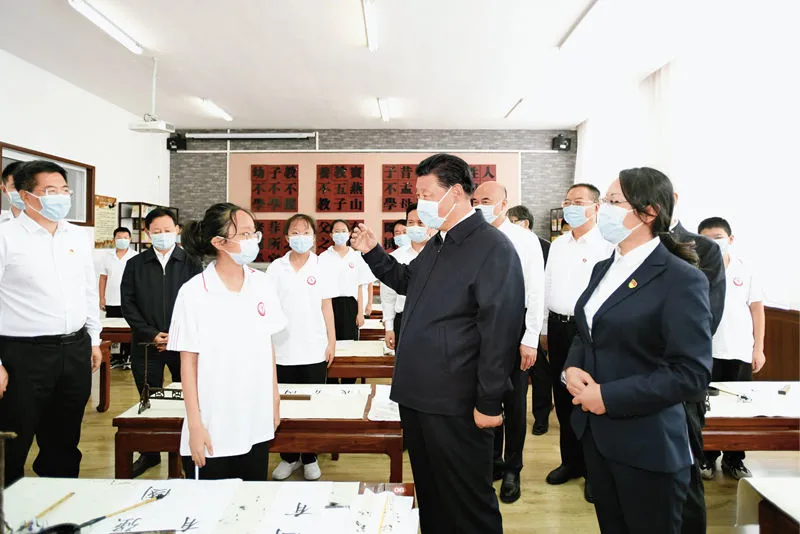 △ 2021年9月13日至14日,中共中央總書記、國家主席、中央軍委主席習(xí)近平在陜西省榆林市考察。這是14日上午,習(xí)近平在綏德實(shí)驗(yàn)中學(xué)考察時,同正在練習(xí)書法的學(xué)生親切交流。新華社記者 李學(xué)仁/攝