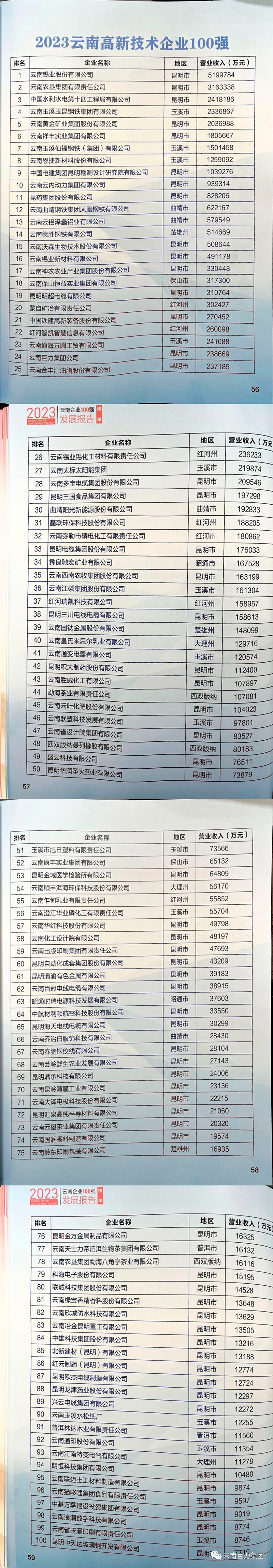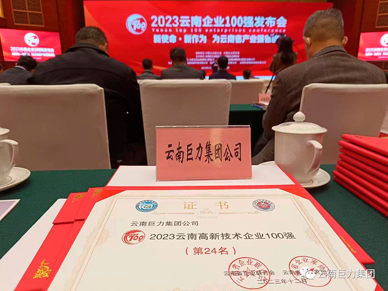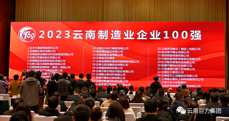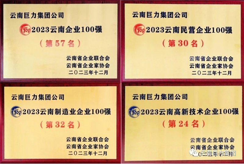 2023年12月16日上午,云南省企業家聯合會、云南省企業家協會在云南海埂會堂召開“2023 云南企業 100 強”發布會。云南巨力集團榮獲:“2023云南企業100強”“2023云南民營企業100 強”“2023云南制造業企業100強”“2023云南高新技術企業100強”四項殊榮。