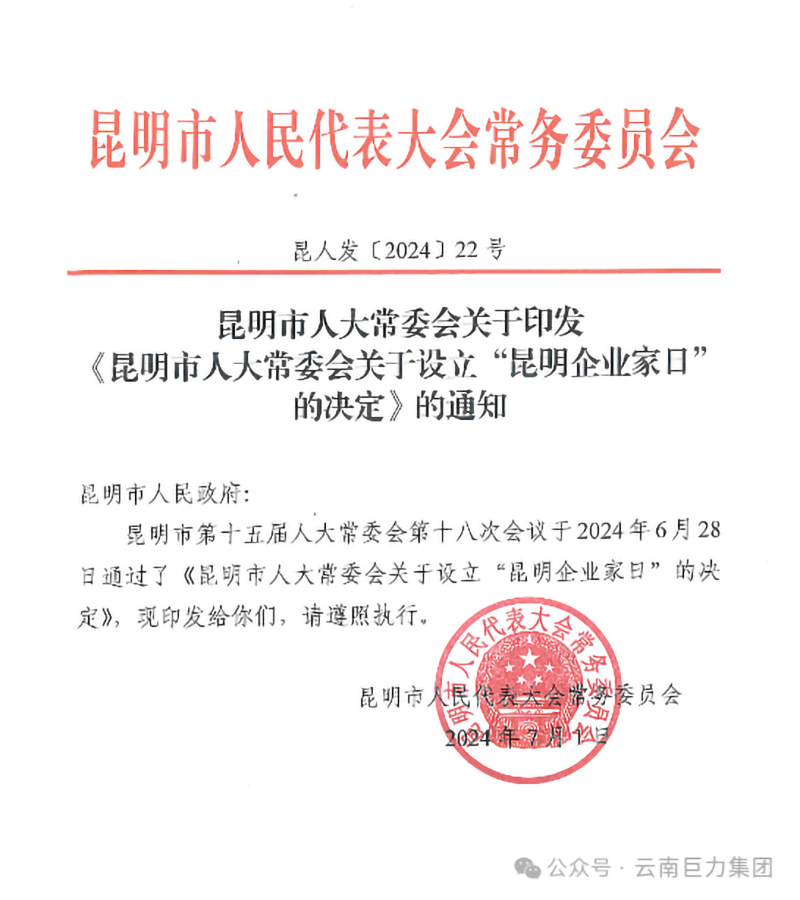2024年7月1日,昆明市人大常委會向昆明市人民政府下發了關于印發《昆明市人大常委會關于設立“昆明企業家日”的決定》的通知文件。文件全文如下: