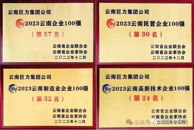 云南巨力集團連續多年榮列“云南民營企業100強”。
