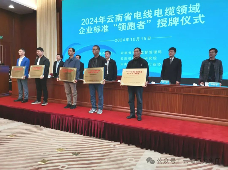 2024年云南省電線電纜領域企業標準“領跑者”名單于10月15日在昆明海埂會堂隆重公布。云南巨力電纜股份有限公司、昆明電纜集團昆電工電纜有限公司、昆明電纜集團電線有限公司、云南多寶電纜集團股份有限公司、昆明海天電線電纜有限公司五家企業憑借其卓越的產品標準和行業影響力榮獲此項殊榮。